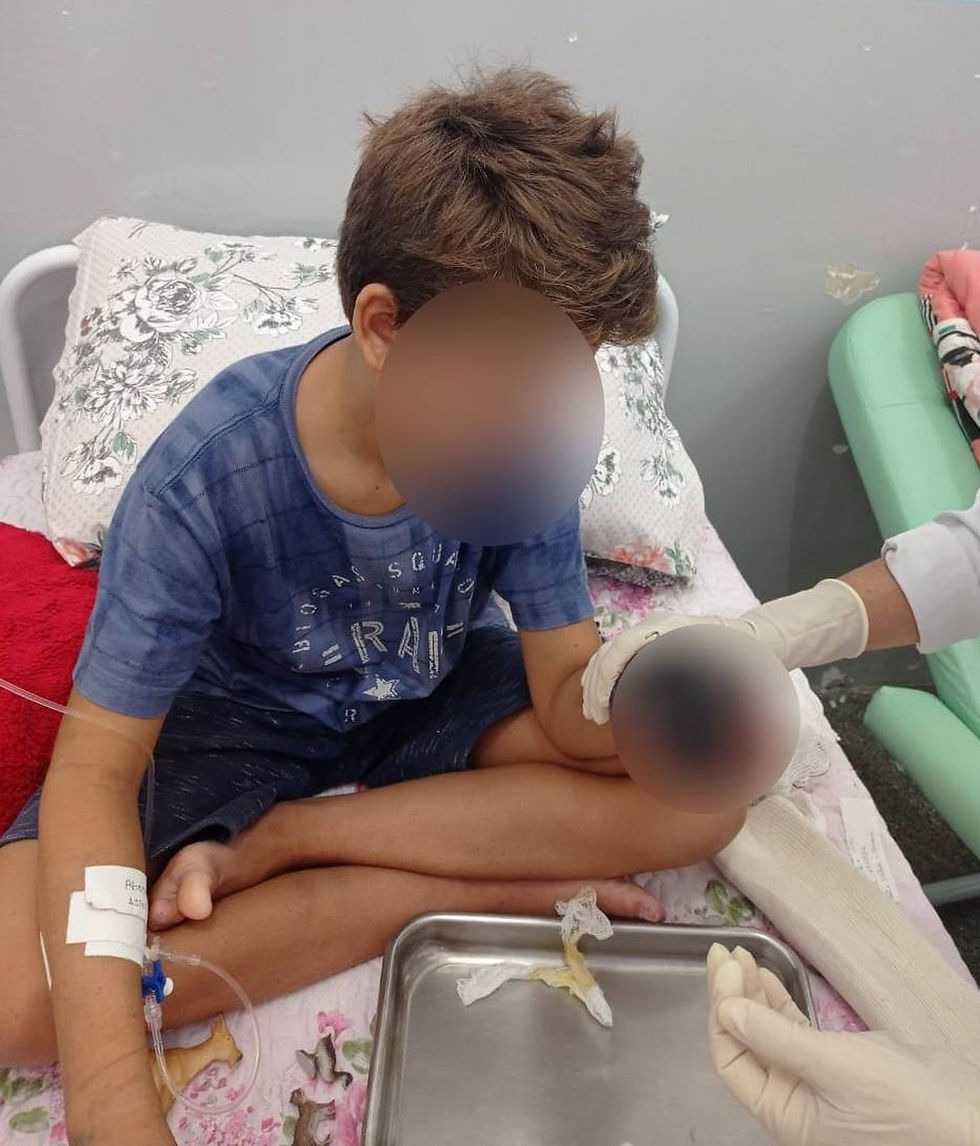 Segundo a família, a criança teve os dois dedos amputados por risco de infecção. Ele também teve parte da pele da mão retirada. Ainda há risco de amputação de outros dedos.